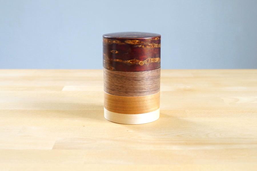 Cette boîte à thé a été assemblée avec quatre essences différentes de bois: écorce de cerisier, noyer, cerisier, et érable. L'écorce de cerisier sauvage est récoltée de façon à permettre sa régénération pour ne pas gêner la croissance des arbres.
