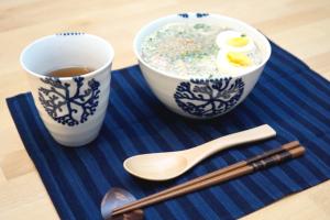 Le motif bleu datant de la période Edo, reproduit la forme d’une algue, et est caractéristique de cette série Mirumon. Il déborde légèrement sur chaque bord du bol pour rappeler discrètement sa présence sur la face opposée.